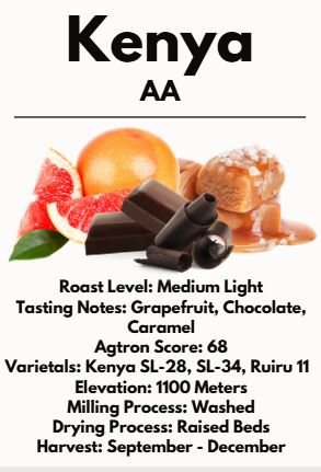 Varietals: Kenya SL-28, SL-34, Ruiru 11